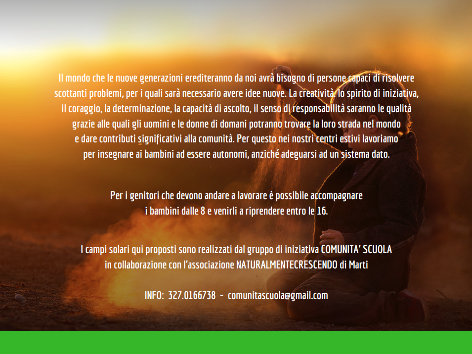 Tra fine agosto e inizio settembre saremo liete di ospitare questo campo solare organizzato e diretto dagli amici del gruppo Comunità’ Scuola :