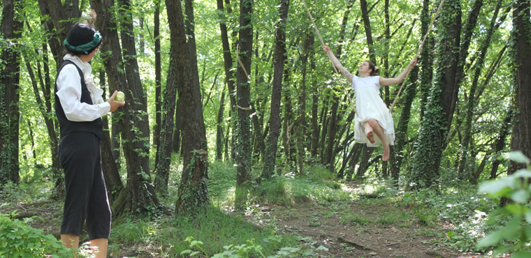 «Si tratta di un mix tra caccia al tesoro, travestimenti, stornelli alla fisarmonica e arrampicate circensi. SoledadNicolazzi e Sara Molon creano uno show bislacco, tra rami volti verso il cielo, personaggi evanescenti e briganti pensili. I bambini assistono allo spettacolo giocando e mangiando la frutta disseminata nel bosco. Ma ci sono anche le voci fuori campo di altri bambini, che ci raccontano dell’amore.