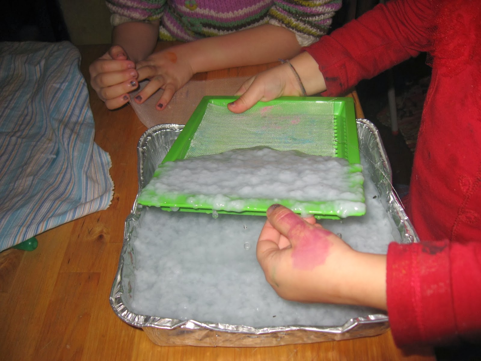 Si travasa il contenuto in una vaschetta e vi si aggiunge ancora tanta acqua, dopodichè si immerge dentro un telaio bucherellato sul cui fondo è adagiata una retina a maglie strette, noi ne avevamo uno fatto apposta, ma si può benissimo ricavare da una cornice di legno sul cui fondo viene graffettata una retina ( perfetta la zanzariera)