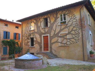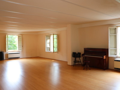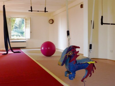 Nell’edificio degli ex-magazzini, dove si stendevano le uve del vin santo, si trova oggi lo studio di 150mq in legno di bambù. È riscaldato da termoventilatori e da una stufa a legna in maiolica, è dotato di un pianoforte verticale e offre la possibilità di usare attrezzature per il circo e tatami per il lavoro a terra.